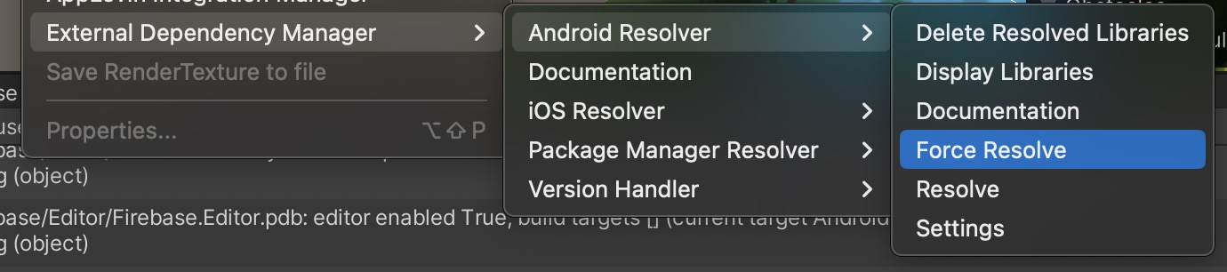만일 Force Resolve를 이용했는데 Resolving Android Dependencies 창에서 라이브러리들을 다시 다운로드 받는 프로세스가 보이지 않고 바로 success가 출력되는 경우 불필요한 custom manifest와 custom gradle을 비활성화한 뒤 다시 시도를 해봐야 합니다.